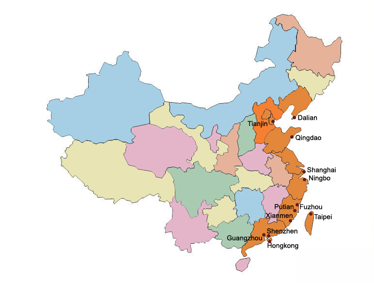 China: Dalian, Tianjin, Qingdao, Shanghai, Ningbo, Xiamen, Putian, Fuzhou, Shenzhen, Guangzhou, Hong Kong, Taipei (Taiwan)